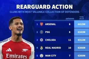 各队后卫总身价排名:阿森纳4.15亿欧居首,巴黎、切尔西二三位