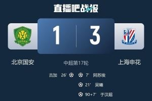 体育资讯7月19日讯 中超第17轮,北京国安1-3不敌上海申花。